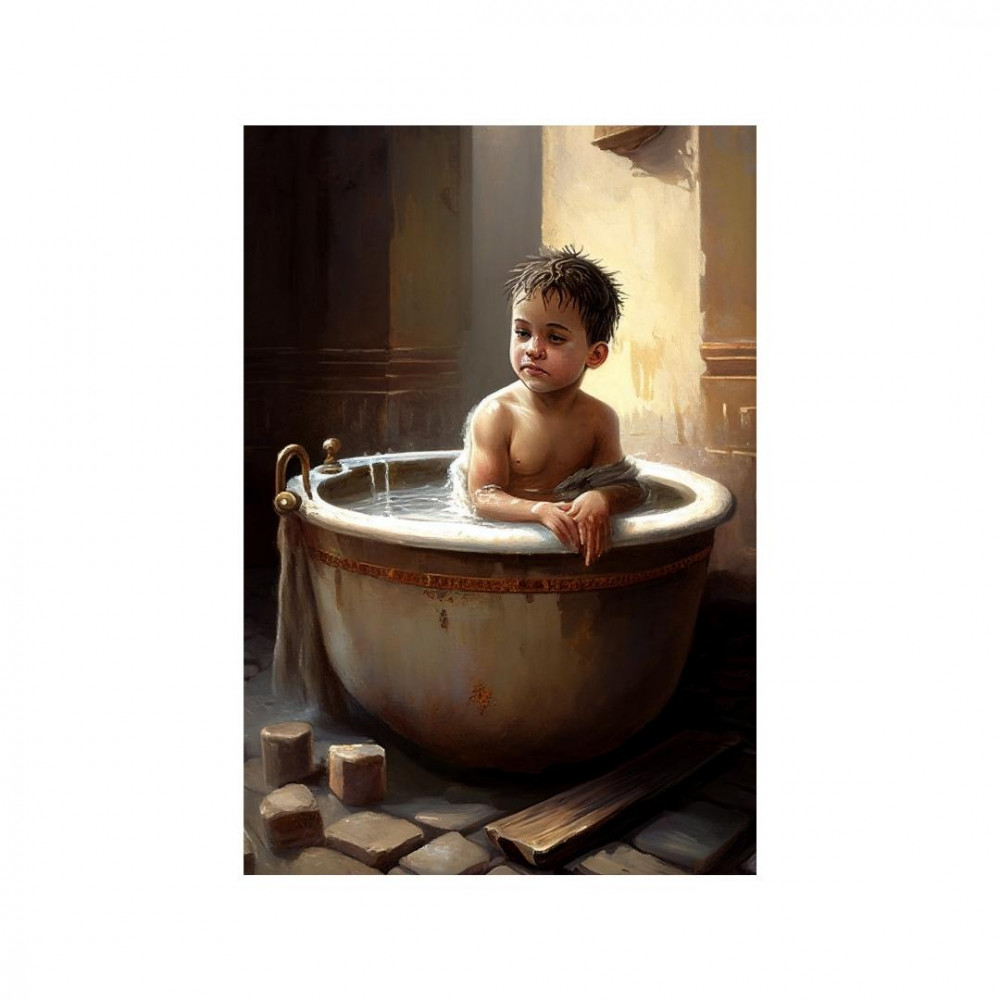 - العناصر البصرية: الطفل داخل الحوض، النظرات المليئة بالبراءة، والخلفية الهادئة التي تعكس سكون اللحظة.